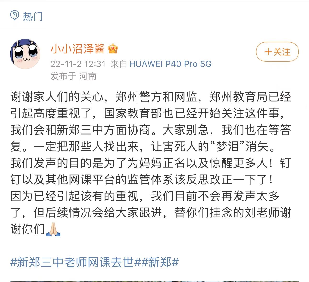 刘老师的女儿在2日中午也发微博称,当地警方和网监等部门已经引起高度重视了。“我们会和新郑三中方面协商,也希望妈妈的事情能够惊醒更多人,一些网课平台和相关的监管体系该反思改正一下了。”刘老师女儿表示。