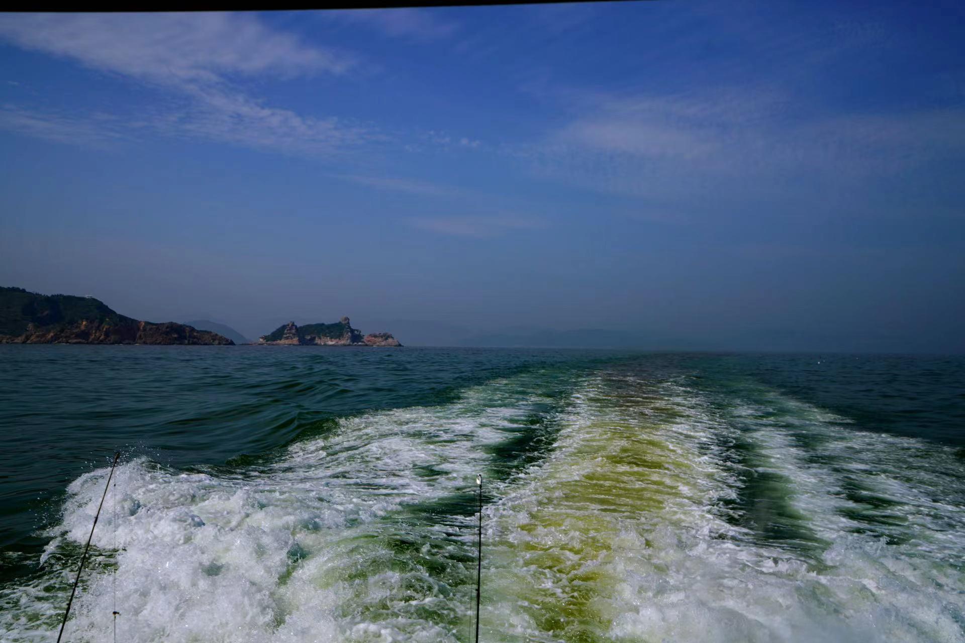 随着船行速度的不同,浪的高度不同,一朵朵浪花折射着阳光,也是一道道风景线。