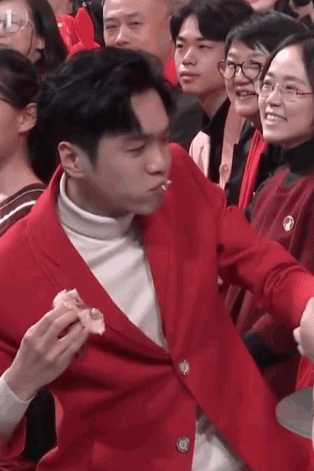 前脚刚因为外套出圈,后脚就在台下吃烧鸡。台上岳云鹏玩魔术变出烧鸡,台下张若昀抢着要。