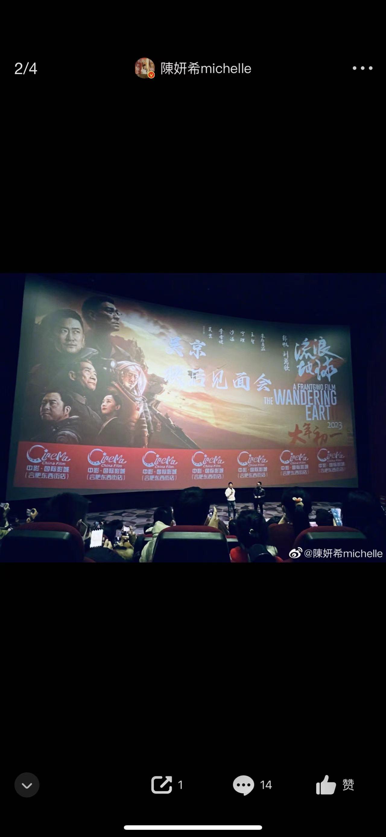 1月26日陈妍希晒出带着儿子小星星一起观看电影的合照,她在配文中写道:今日是第一次带陈星星去电影院看电影,选择的影片是《流浪地球2》,觉得特别有意义。